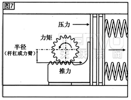 在彈簧復(fù)位的應(yīng)用中,輸出力矩是在兩個不同的操作過程中所得,(如圖7和8所示)。根據(jù)行程位置(0。和90。),每一次操作產(chǎn)生兩個不同的矩值。彈簧復(fù)位執(zhí)行機(jī).構(gòu)的輸出力矩由力(空氣壓力或彈簧作用力)乘上力臂所得。