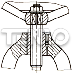 | 手輪固定在閥桿的方頭上,閥桿螺母裝在閥蓋當(dāng)中并用緊定螺釘固定 | ![]() |