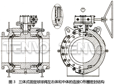近幾年來,已經廣泛采用O形橡膠密封圈來替代墊片,效果良好,尤其是在三體式固定球閥的左右體和中體的連接,幾乎都采用O形圈,密封性能良好,如圖2和圖3所示。