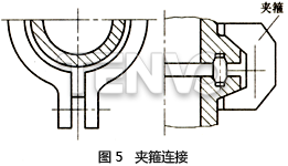 夾箍是一種不帶法蘭的連接,如圖5所示,夾箍連接使螺栓的數(shù)量減少到兩個,使組裝和拆卸都簡化了,有利于快速拆卸。同時外形尺寸和重量都有所減少,目前有些部門已大量采用。