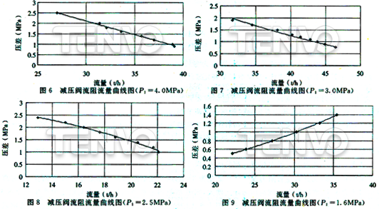 圖6~圖9中以Y43H—40 DNl00被測閥為例,分別保持某一閥前進口壓力(P1=4.0MPa、P1=3.0MPa、P1=2.5MPa、P1=1.6MPa)不變時的“流阻——流量特性”曲線圖。