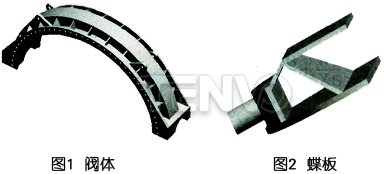 在Pro/E中,通過拉伸、旋轉(zhuǎn)、混合等手段建立水輪機(jī)進(jìn)水蝶閥(如圖)閥體和蝶板三維模型,對一些與強(qiáng)度和剛度關(guān)系不大的細(xì)部結(jié)構(gòu),可以進(jìn)行簡化。由于蝶閥幾何形狀和受力狀況為對稱結(jié)構(gòu),為節(jié)約計算機(jī)運算時間,可以只選取一半來分析。建模時,應(yīng)注意單位的統(tǒng)一,建議使用國際單位制。長度:m,力:N,質(zhì)量:千克。