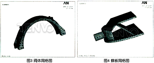 對閥門和蝶板,可選取用十節(jié)點的solidl87單元,利用ANSYS智能網(wǎng)格劃分工具M(jìn)eshToot,采用四面體自由劃分網(wǎng)格。網(wǎng)格的疏密程度可根據(jù)產(chǎn)品要求決定,對重要部位可局部細(xì)化。