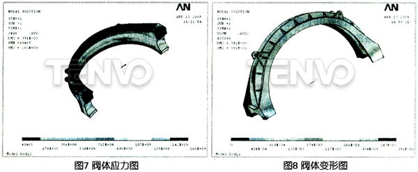 通過 ANSYS 的通用后處理器,我們可以得到產(chǎn)品的主應(yīng)力、剪應(yīng)力、等效應(yīng)力以及產(chǎn)品變形等彩色云圖,再根據(jù)強(qiáng)度理論來判斷產(chǎn)品的受力情況。對于脆性材料,通常采用第一強(qiáng)度理論,使第一主應(yīng)力б1≤[б],對于塑性材料, 則采用第四強(qiáng)度理論,使等效應(yīng)力Von Mises stressa≤[б]即能滿足強(qiáng)度要求,至于變形程度則根據(jù)產(chǎn)品設(shè)計需求確定。從閥體和蝶板應(yīng)力和變形云圖中,可看出閥體最大應(yīng)力為160MPa,最大變形為0.391mm。均位于軸頭處。蝶S板最大應(yīng)力為164MPa,筋板邊緣和閥軸根部應(yīng)力較大。最大變形為1.187mm,位于蝶板中部邊緣。