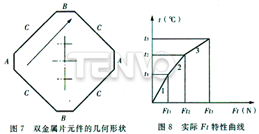 根據(jù)熱雙金屬片的性質(zhì)可知,熱雙金屬片在受熱時不僅產(chǎn)生縱向彎曲而且產(chǎn)生橫向彎曲,并且縱向彎曲的速度大于橫向彎曲的速度,隨著溫度的進(jìn)一步升高橫向彎曲速度逐漸增大而縱向彎曲速度逐漸減小。因此在該設(shè)計中利用了這一性質(zhì)把元件形狀設(shè)計成幾個簡單的幾何形狀的組合,從而使它們分別進(jìn)入工作狀態(tài)。這樣則將Ft曲線變?yōu)閹讞l斜率不等的直線,疊加到一起則成為一條與蒸汽的飽和溫度壓力曲線相近似的曲線。