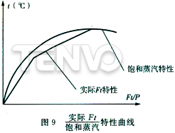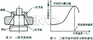 根據(jù)流體熱動力學(xué)原理及有關(guān)資料介紹,流體通過兩極節(jié)流環(huán)時,中問壓力較小;當(dāng)水溫超過一定值后,中間壓力逐漸升高;當(dāng)水溫接近飽和溫度時中問壓力最高。對于飽和水中問壓力稍有降低,對于飽和蒸汽中問壓力又有所下降。該特性用曲線表示如圖11。