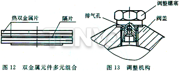 該閥在閥蓋頂部設(shè)計有調(diào)整機(jī)構(gòu)——調(diào)整螺塞,如圖13。該元件的設(shè)置是為了便于使用和維修,使該閥在設(shè)備上不必打開閥蓋即可調(diào)整雙金屬片的冷調(diào)間隙量,通過間隙量的調(diào)整還可改變其排水溫度(即:通過改變冷度來改變排水溫度)。調(diào)整螺塞上還設(shè)有排氣孔,可避免操作時發(fā)生危險。