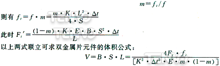 根據(jù)材料力學(xué)原理及該設(shè)計的結(jié)構(gòu),熱雙金屬元件的體積系數(shù)α可又下式計算: