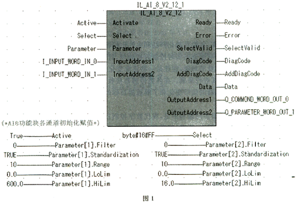 系統(tǒng)參數(shù)設(shè)置即功能塊的初始化賦值。如圖1所示。IB IL_AI_8/SF模塊使用Interbus相互獨立的配置各通道,PC WORX編程環(huán)境里,添加如圖所示功能塊,按照功能塊本身的要求定義好功能塊連接的各變量及其類型。