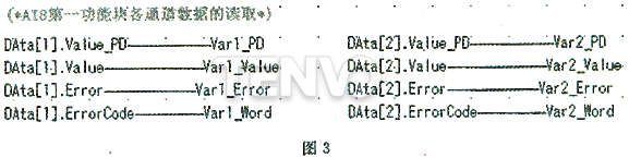 IB IL_AI_8/SF模塊的各通道實測值存放在功能塊中結(jié)構(gòu)化變量Data中,使用時必須先定義各模擬量通道的目標數(shù)據(jù)變量,如圖3所示,必須對Data變量進行設(shè)置,以便獲取目標數(shù)據(jù)輸出。