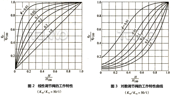 圖2和圖3用于選擇有一特定工作特性的調(diào)節(jié)閥。比如,△Pr100/Pso之比在O.4~1之間。線性閥的工作特性應(yīng)該是線性的;△Pr100/Pso之比在O.05~0.3之間,推薦用對數(shù)閥。如果需要一個非線性工作特性,以補償一個非線性的自動化調(diào)節(jié)系統(tǒng),例如,補償非線性的孔板流量變送器,則應(yīng)在特性曲線族中,選擇最恰當(dāng)?shù)奶匦浴?/p>