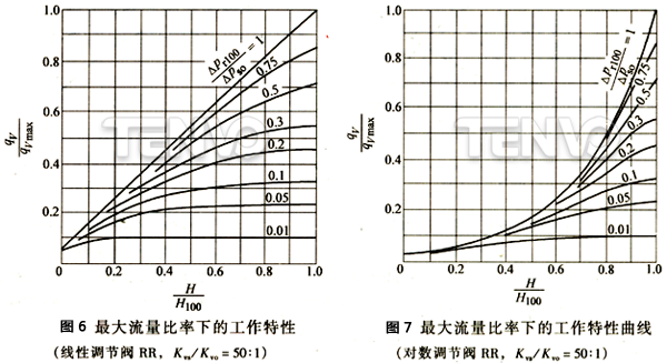 對于Ψ=1,有△pr100=△pso,即升壓設(shè)備產(chǎn)生的全部壓力損失在調(diào)節(jié)閥上。在這種情況下,流量有最大值qvmax。Ψ<1的情況下,對于管路系統(tǒng)有更實際的意義。這相應(yīng)于調(diào)節(jié)閥上的壓力損失△pr較小,即通過它的液體流量也較小的情況。對于同樣尺寸和同樣開度的調(diào)節(jié)閥,液體流量減少,與閥門上的壓力損失成比例,這就是圖6和圖7中工作特性曲線的意義。