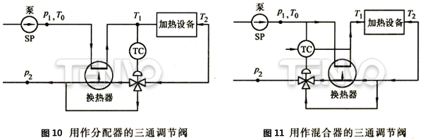 (1)三通調(diào)節(jié)閥的工作特性 三通調(diào)節(jié)閥能夠用來(lái)作分配器,如圖10所示;也能夠用作混合器,如圖11所示。泵SP推動(dòng)溫度為T0、壓力為p1的液體通過一個(gè)換熱器,從換熱器出來(lái)的液體溫度必須調(diào)節(jié)到T1值。加熱設(shè)備可以是一個(gè)具有放熱反應(yīng)的化學(xué)反應(yīng)器。從加熱設(shè)備出來(lái)的液體溫度是T2。