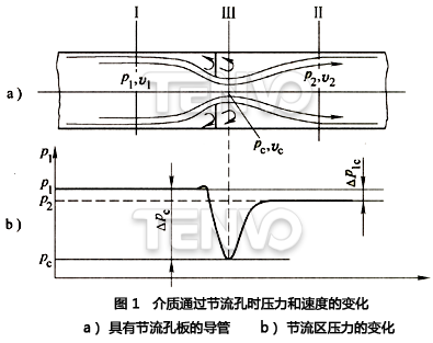 圖1示出介質(zhì)通過節(jié)流孔時,壓力和速度的變化。在截面Ⅰ,壓力為p1,流速為v1;由于節(jié)流孔板的作用,流線開始收縮,在最小截面Ⅲ處,壓力pc最小而流速vc最大;通過截面Ⅲ后,速度開始下降,壓力開始上升,到達截面Ⅱ時,壓力為p2,流速為v2。由于通過節(jié)流區(qū)時要克服摩擦力,故通過節(jié)流區(qū)以后,介質(zhì)的壓力就不能恢復到p1值。考慮這個現(xiàn)象,伯努利方程增加一項△p1c,代表壓力損失。對于截面Ⅰ和Ⅲ,應(yīng)用伯努利方程,得