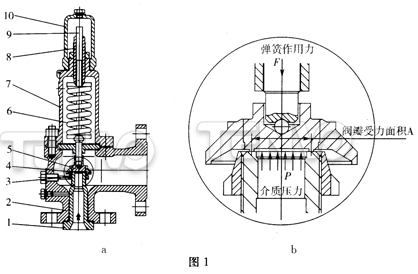 常規(guī)彈簧加載式安全閥如圖1所示,它由主體部分(2閥體、7閥蓋和10閥帽)組成了一外形筐架,結(jié)合主要內(nèi)件部分(1閥座、4升力盤、5閥瓣、6彈簧、9閥桿)成了一體,形成了一臺(tái)壓力釋放裝置,其內(nèi)腔閥芯部件的結(jié)構(gòu)決定了相互作用力的關(guān)系如圖1b所示,閥的啟閉是基于相互作用力的平衡原理來操作完成的。預(yù)先將彈簧作用力F設(shè)定成與整定壓力Ps和關(guān)閉著的閥瓣受力面積A的力相等,見式1。