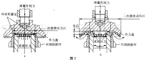 閥門一旦開啟后,由于升力盤的作用,在介質(zhì)排出和轉(zhuǎn)向的同時(shí)立即在升力盤下方形成積聚升力(見圖2b)。并迅速產(chǎn)生二次排放動(dòng)壓區(qū),來克服由于開高帶給彈簧的壓縮所產(chǎn)生的附加力和升力盤背面的背壓力使閥瓣迅速升起,介質(zhì)排出量快速增加。