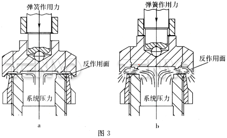 當(dāng)壓力釋放裝置所保護(hù)系統(tǒng)的介質(zhì)為不可壓縮液體時(shí),以上解析中的圖2和式(2)均發(fā)生了變化。變化發(fā)生在可壓縮氣體所產(chǎn)生的膨脹力不會(huì)在不可壓液體介質(zhì)中出現(xiàn),因此液體介質(zhì)用泄壓閥不會(huì)像氣體介質(zhì)用安全閥那樣突開,液體介質(zhì)用泄壓閥必須依靠反作用力實(shí)現(xiàn)開啟,當(dāng)閥門開啟前,液體介質(zhì)和氣體介質(zhì)作用在閥瓣下的力是相同的,(1)式仍然成立。但從這一點(diǎn)開始,力的關(guān)系就完全不同了。如圖3所示,開啟之初,排放出的液體所形成的介質(zhì)流非常細(xì)薄,迅速在密封面問向四周散開,見圖3a。排放的介質(zhì)擊打著閥瓣座的反作用面并斜向下流動(dòng),產(chǎn)生一種使閥瓣向上移動(dòng)的作用力(渦流)。這種作用力的典型特征是膨脹力和推力均較小,是依靠系統(tǒng)的超壓來幫助提高作用力。初始在超壓的3%~5%之間,力的積聚非常緩慢。隨著流量的逐漸增加,通過閥座喉部的介質(zhì)流流速也隨著增加。這種動(dòng)量以及快速排放的介質(zhì)從反作用面轉(zhuǎn)而向下流動(dòng)時(shí)所產(chǎn)生的反作用力,見圖3b。當(dāng)這些力足夠大時(shí),會(huì)使閥瓣向上升起,并且克服彈簧變形式所產(chǎn)生的力。典型的情況是在超壓達(dá)10%~15%時(shí),閥瓣會(huì)突然升起在整個(gè)升程的50%~100%之間波動(dòng)。隨著超壓的增加,這種力會(huì)繼續(xù)增加,驅(qū)使閥瓣達(dá)到額定升程。