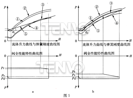 從圖2和圖3動(dòng)態(tài)解析可見,再行關(guān)閉是閥瓣和閥瓣座從高升程至低升程的轉(zhuǎn)變,由于液體不能像蒸汽那樣可產(chǎn)生膨脹力,所以設(shè)計(jì)用于液態(tài)介質(zhì)的泄壓閥,如果用于氣體介質(zhì)會(huì)顯示比用于液體介質(zhì)有較大的啟閉壓差(典型的約為20%)。此外,如果要求將設(shè)定為液體介質(zhì)用的閥門用于氣體操作或反過來,則整定壓力和超過壓力均會(huì)出現(xiàn)一些偏差。再行關(guān)閉還與彈簧作用力有關(guān)。如圖5所示為典型的彈簧加載式安全閥的動(dòng)態(tài)特性曲線。圖中的①、②、③、④為模似的流體動(dòng)態(tài)升力曲線,⑤為所配備的彈簧剛度曲線。當(dāng)閥的入口壓力充分釋放后下降至低于整定壓力(圖5中的曲線④)時(shí),這時(shí)彈簧力(圖5中的曲線⑤)已能夠克服所有動(dòng)態(tài)升力,曲線④已完成低于了曲線⑤,閥門關(guān)閉。閥門回座(關(guān)閉)時(shí)的壓力就是關(guān)閉壓力Pr。從圖5a和圖5b中還可見配備的彈簧剛度越大(***>***)。即在動(dòng)態(tài)的釋放過程中,圖5b的彈簧作用力均大于圖5a。其回座壓力Pr也越高,說明了圖5b所配備的設(shè)計(jì)結(jié)構(gòu)有利于及時(shí)再行關(guān)閉。