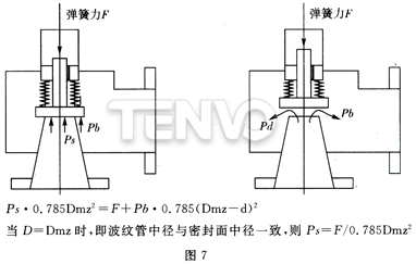 可見當(dāng)背壓力Pb>Pd·[2/(k+1)]k/(k-1)時(shí),重閉式壓力釋放裝置的出、入口介質(zhì)流動(dòng)的釋放會(huì)出現(xiàn)亞臨界流動(dòng)狀況。這種由背壓力過高帶來的亞臨界流動(dòng)會(huì)導(dǎo)致壓力釋放裝置的排量降低以及整定壓力的準(zhǔn)確性。圖6為壓力釋放閥的示意圖,圖6a為常規(guī)的壓力釋放閥,它的整定壓力Ps與彈簧力F和密封面中徑Dmz有關(guān)。圖6b為常規(guī)壓力釋放閥受到背壓力Pb的影響,它的整定壓力Ps與背壓力Pb和背壓力所作用的結(jié)構(gòu)面積差值(Dmz—d)有關(guān),這樣很明顯背壓力Pb直接影響Ps。為了避免Pb的影響,在壓力釋放閥的結(jié)構(gòu)中引入了波紋管平衡式壓力釋放裝置。圖7為波紋管平衡式壓力釋放閥的示意圖,在結(jié)構(gòu)設(shè)計(jì)時(shí)設(shè)置了波紋管,而且使得波紋管的中徑D與密封面中徑Dmz完全一致,這樣函數(shù)式O.785Pb(Dmz2-D2)自動(dòng)消失,整定壓力Ps就不受Pb的影響。所以,設(shè)置有波紋管的平衡式壓力釋放閥可應(yīng)用于有背壓力的場(chǎng)合。