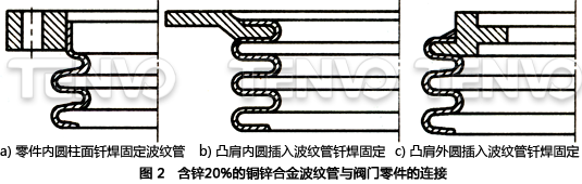 含鋅的20%的銅鋅合金波紋管使用溫度和壓力都比較低,因此,它與閥門零件的連接可以采用軟質(zhì)鉛錫為焊劑的釬焊,對于重要的連接,通常采用硬質(zhì)焊劑(銀)的釬焊。
