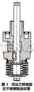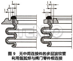 06Crl9Ni10波紋管使用溫度可達450℃,它適用于腐蝕性介質(zhì)的閥門。這種波紋管帶有焊接的法蘭,如圖9所示,利用電弧焊將法蘭焊接在閥門零件(閥蓋或閥桿)上。這種固定方法比較牢固。