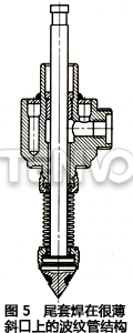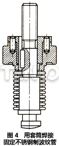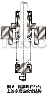 2)多層波紋管。不銹鋼制多層波紋管帶有連接螺紋套筒,利用螺紋套筒可以與其他零件相連接。通常在螺紋套筒上做出一個很薄的接頭,沿管接頭圓柱面用電脈沖焊(圖5)或沿管接頭邊緣氬弧焊(圖6)把管接頭焊在連接件或接縫上。采用電脈沖焊時,波紋管的更換比較困難。如圖7采用機械固定,這種方法檢修費用較少。