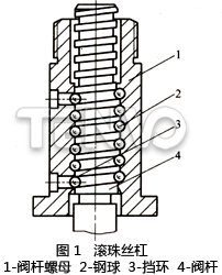隨著工業(yè)的迅速發(fā)展,在一些特殊的閥門(mén)上已開(kāi)始使用滾珠絲杠結(jié)構(gòu),如圖1所示。閥桿和閥桿螺母上的梯形螺紋滾道內(nèi)放置鋼球。當(dāng)轉(zhuǎn)動(dòng)閥桿螺母時(shí),鋼球也跟著推進(jìn),使閥桿作升降運(yùn)動(dòng)。這種結(jié)構(gòu)的最大優(yōu)點(diǎn)是用滾動(dòng)摩擦替代了滑動(dòng)摩擦,大大地減小了摩擦力矩,使操作轉(zhuǎn)矩隨之減小。缺點(diǎn)是結(jié)構(gòu)復(fù)雜,加工要求高,目前,僅跟于特殊閥門(mén)上使用。