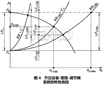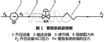 圖1所示為管路系統(tǒng)的原理圖。這個系統(tǒng)的壓力損失分為:調(diào)節(jié)閥上的壓力損失△pr;管道上的壓力損失△pe;升壓設(shè)備內(nèi)部的壓力損失△psio令壓力損失△pe和△psi之和為△pL,即