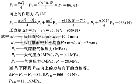 如果氣隙腔壓力降到P1<P1臨,活門可以在向上的氣壓力的作用下自動抬起。從圖2看出,氣隙小到2mm時電磁鐵吸力只有4.4N,而氣壓力P1從P1臨=11.15MPa,上升僅O.1MPa到11.25MPa,活門受到的向下的力增加到8.25N。所以活門的抬起主要靠氣隙腔壓力P1的下降。活門在向上抬起時還受到活門與導(dǎo)套間的摩擦力的作用,由于氣體壓力高,活門與導(dǎo)套間的氣壓夾緊力大,摩擦力也大,所以活門要抬起,P1一定要遠(yuǎn)小于P1臨。