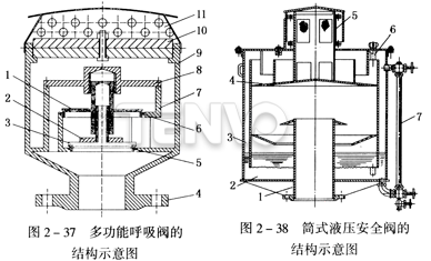 (6)筒式液壓安全閥。圖2-38是筒式液壓安全閥的結(jié)構(gòu)示意圖。它由儲(chǔ)液槽、懸起式隔板、安全閥罩蓋、加油管等組成。它與呼吸閥安裝于同一座(地上、半地下)油罐。